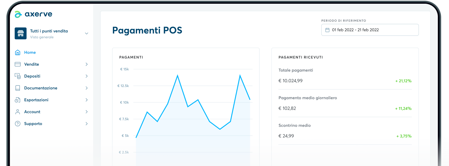 Con la dashboard Axerve myStore puoi tenere tutto facilmente sotto controllo con una interfaccia intuitiva e semplice da utilizzare per avere un aggiornamento in tempo reale sui pagamenti incassati tramite POS Easy. Si tratta di un servizio smart che include anche un supporto clienti tramite una apposita chat con operatori disponibili dal lunedì al venerdì dalle 9 alle 18.