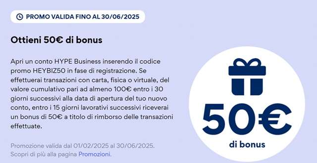 Per ottenere 50 euro di bonus occorre aprire HYPE Business, inserendo in fase di registrazione il codice promozionale HEYBIZ50. In seguito, i titolari del nuovo conto devono effettuare pagamenti per un valore cumulativo di almeno 100 euro entro i 30 giorni successivi all’apertura del conto.