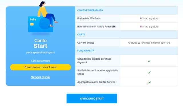 - Operatività Agevolata: Prelievi da ATM Sella illimitati e gratuiti, bonifici online in Italia e Paesi SEE senza limiti.