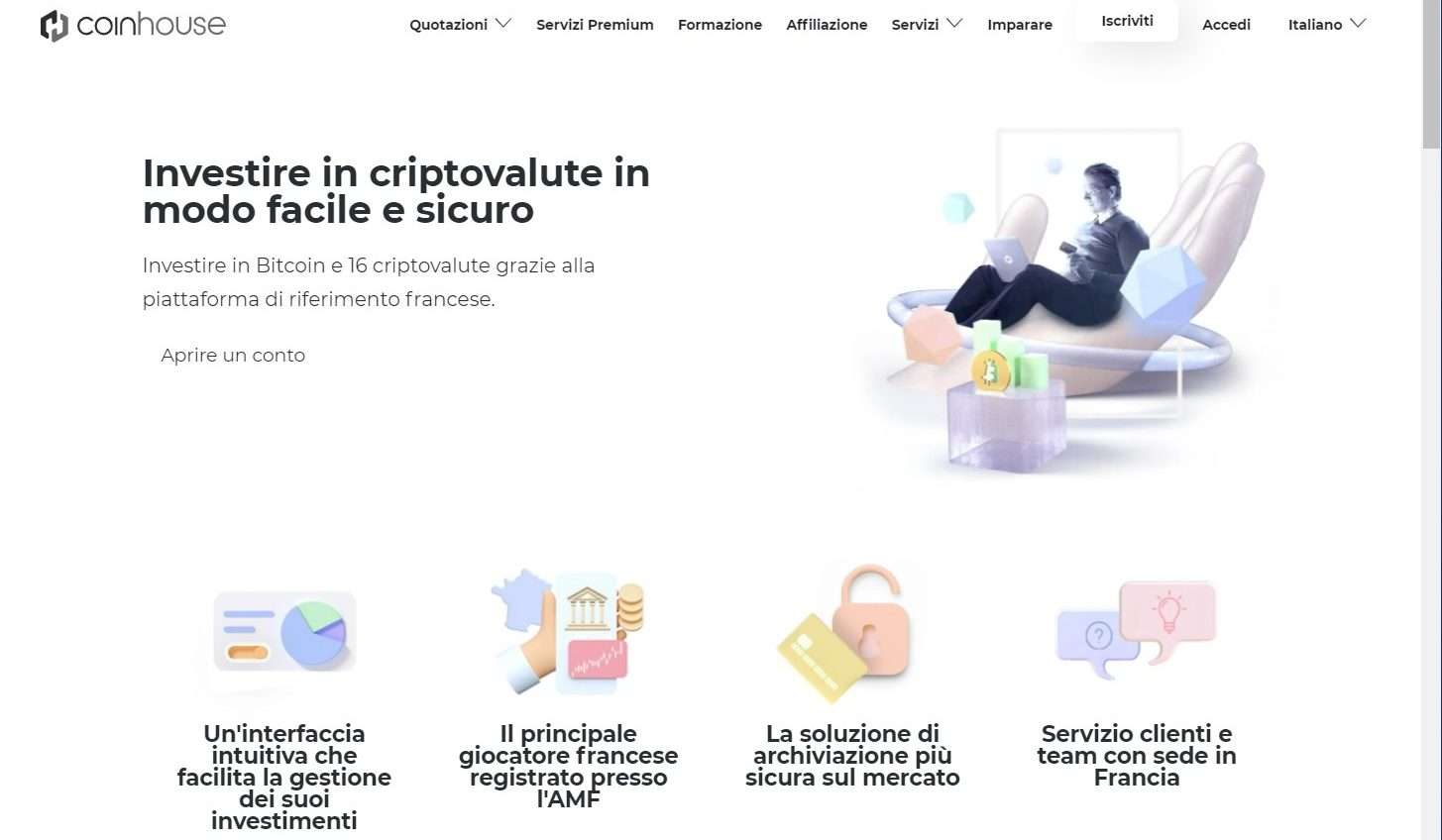Altra piattaforma interessante che abbiamo trovato in rete che permette di investire in modo sicuro e con capitali anche abbastanza contenuti per cominciare a muovere i primi passi nell’ottica crypto è quella di Coinhouse, che permette di aprire un conto in modo rapido con verifica dell’identità e possibilità di iniviare a investire a partire da 20€.