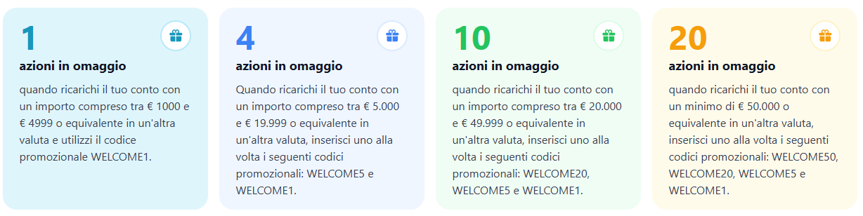- Ricarica pari o superiore a 50.000 euro: 20 azioni gratuite con l’aggiunta del codice WELCOME50, WELCOME20, WELCOME5 e WELCOME1