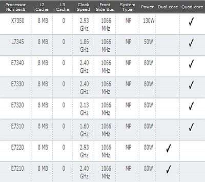 Qui sotto una tabella elenca i modelli di Xeon MP Tigerton appena lanciati da Intel e le relative caratteristiche tecniche. I prezzi vanno da 856 a 2.301 dollari.