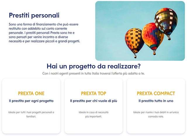 Qualunque sia il progetto che vuoi realizzare, grande o piccolo, puoi contare su un prestito personale per finanziarlo: valuta le opzioni proposte da Prexta e scegli quella più adatta a te, che tu voglia acquistare o rinnovare la tua abitazione, cambiare automobile, pianificare un viaggio con la tua famiglia o altro ancora. La restituzione avverrà con addebito sul conto corrente, su base mensile. È accessibile da dipendenti del settore pubblico e privato, così come dai pensionati, con età compresa dai 18 agli 83 anni.