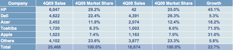 A registrare il maggiore successo negli Stati Uniti è Apple, che con oltre un milione e mezzo di unità vendute mantiene il 7,4 per cento del market share USA: un buon risultato se si prende in considerazione la mole di netbook a basso costo che hanno fatto la fortuna di altri giganti come Toshiba e HP, le quali hanno rispettivamente venduto il 71 e il 45 per cento in più. Di diversa portata tuttavia le rispettive fette di mercato: HP detiene il 29,2 per cento mentre Toshiba, che sopravanza proprio Apple e incalza ora Acer, supera di poco l’otto per cento.