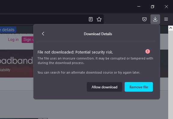 Dato che il file potrebbe essere diverso da quello cercato, il browser non effettuerà il download. L’utente può tuttavia scaricare il file a suo rischio e pericolo. Mozilla non vuole bloccare tutti i download HTTP. Infatti basta copiare la URL nella barra degli indirizzi per avviare il download. Inoltre Firefox 92 non bloccherà i download HTTP da pagine HTTP.