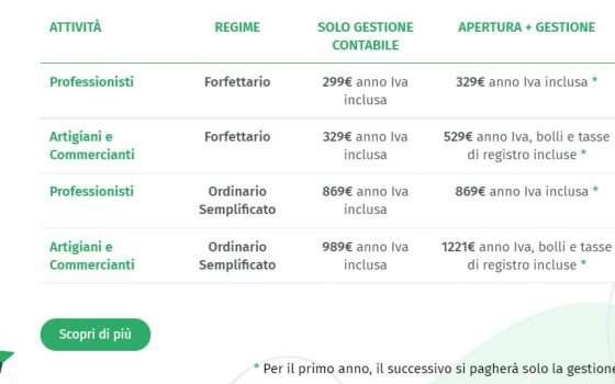 Per aprire una nuova partita partita IVA (in regime forfettario) è sufficiente spendere a partire da 329€ all’anno (IVA inclusa); se abbiamo già la partita IVA la gestione contabile parte da 299€ (IVA inclusa).