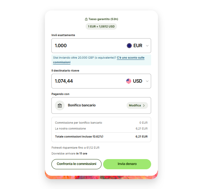 | Wise | 20+ valute | Da 0,47% + tasso di cambio interbancario | Oltre il 50% entro 1 ora |