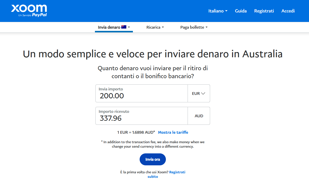 Il funzionamento è molto semplice: basta accedere al proprio account PayPal sul sito ufficiale di Xoom e recarsi nell’apposita sezione per l’invio di denaro. Una volta selezionato l’importo e il Paese di destinazione, si vedranno le commissioni applicate e l’importo effettivo che sarà inviato.