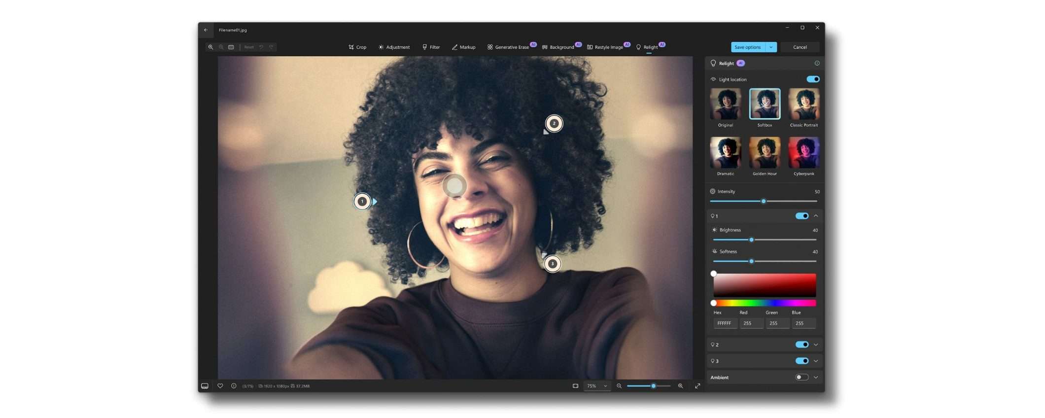 La funzione più interessante si chiama Relight e fa esattamente quello che suggerisce il nome. Illumina le foto come se si avesse avuto un set di luci professionali al momento dello scatto. Si possono aggiungere fino a tre fonti di luce diverse su una singola immagine, personalizzando colore, punto focale, luminosità e intensità.