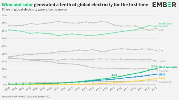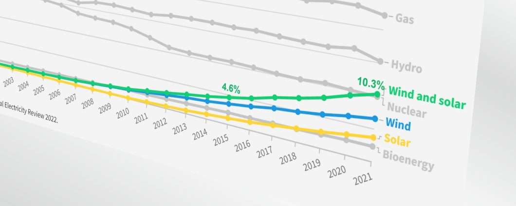 Traguardo raggiunto e quando succede le ambizioni iniziano finalmente a crescere: il combinato disposto di impianti fotovoltaici ed impianti eolici ha raggiunto il 10% della produzione annua di elettricità. Succede nel 2021 e viene fotografato oggi in una ricerca che stima l’impatto dell’energia pulita sul totale dei consumi e, al tempo stesso, traccia la strada che accompagnerà il mercato dell’energia negli anni a venire.