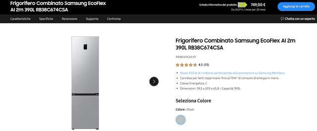 La promozione in corso sul sito samsung.com, con protagonista il frigorifero combinato EcoFlex di Samsung, prevede anche la possibilità di pagare a rate: 24,97 euro al mese per 30 mesi senza interessi.