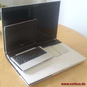 Il netbook di Fujitsu Siemens, che dovrebbe entrare a far parte della nota linea di laptop Amilo, è stato “ritratto” nella foto accanto vicino ad un notebook da 17 pollici. L’immagine suggerisce che le sue dimensioni siano simili a quelle dell’Eee PC 900 , con uno schermo da 8,9 pollici e un touchpad piuttosto ampio.