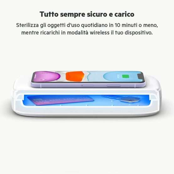 Se apri il coperchio, una luce UV è pronta a rimuovere il 99,9% di ciò che sta mettendo radici sul tuo smartphone; batteri, virus e così via. Se invece appoggi il tuo dispositivo sopra, sblocchi in un istante la ricarica wireless senza fili e velocissima per far tornare il tuo bimbo subito pronto all’azione.