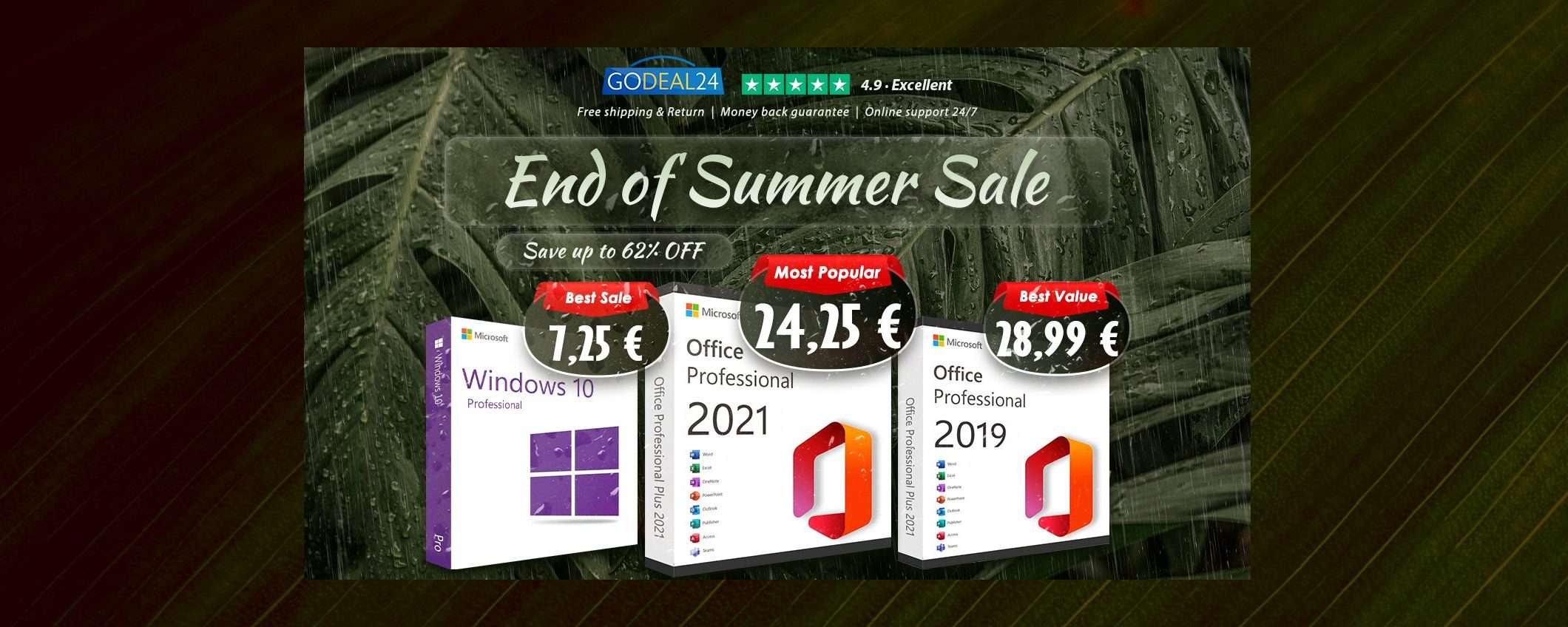 Su Godeal24, puoi risparmiare molto tempo e denaro con licenze Microsoft scontate, i principali software di sicurezza IT e altri strumenti informatici. Ottieni il sistema operativo Windows e MS Office a un prezzo imbattibile. Porta avanti acquisti senza problemi con la consegna digitale di Godeal24, che invia il tuo software direttamente alla tua e-mail entro pochi secondi dall’acquisto. Inoltre, con una valutazione TrustPilot eccellente del 98% e il supporto tecnico di esperti 24 ore su 24, 7 giorni su 7, puoi essere sicuro della qualità del prodotto che stai acquistando.