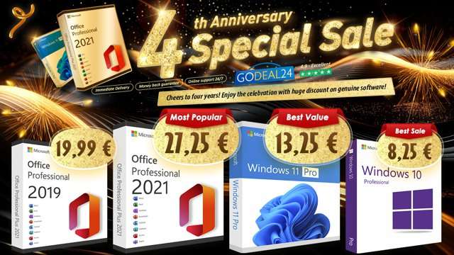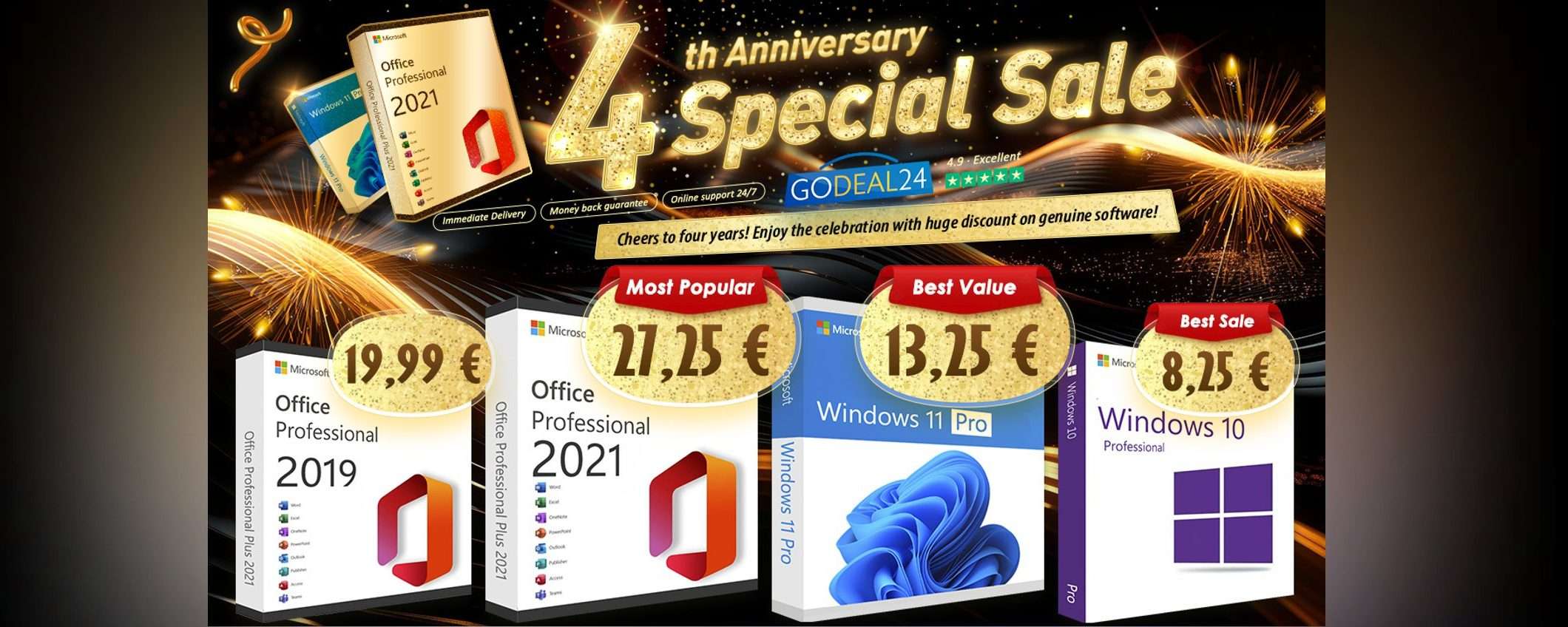 Godeal24 festeggia il suo quarto anniversario con un’eccellente vendita che offre prezzi speciali sulle licenze MS attraverso la 4th Anniversary Sale di Godeal24. La vendita, che si è svolta dal 19 al 26 maggio, ha introdotto anche pacchetti multi-chiave. Esploriamo le principali offerte sulle licenze Microsoft. Ottieni Microsoft Office Professional 2021 a vita per soli 27,25€ mentre il prezzo originale è di $ 439,99. Godeal24 ti farà risparmiare oltre il 90%. Per un’azienda o una famiglia, è molto più adatta la chiave Office 2021 Pro per 5 PC, che offre Office 2021 Professional a soli 17,25€ per PC! Il potente Office 2021 ha bisogno del supporto del sistema operativo Windows per svolgere un ruolo! Se stai ancora utilizzando una versione precedente del sistema operativo, approfitta di questa offerta e acquista l’ultimo Windows 11 Pro a partire da un prezzo pazzesco di 13,25€. Se stai pensando di acquistare una suite a vita e il sistema operativo Windows, questo è un ottimo modo per tenere più soldi in tasca. L’offerta a tempo limitato terminerà in breve tempo! Il team del servizio clienti 7/24 ti offrirà aiuto gratuito in caso di problemi!