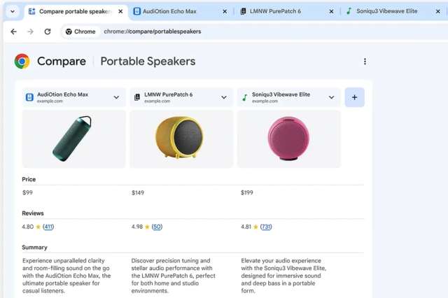 La seconda novità è utile per lo shopping. Grazie a Tab Compare non sarà più necessario passare da una scheda all’altra per leggere le recensioni e cercare i prezzi migliori. Gemini permette di creare una tabella con i dettagli dei prodotti (specifiche, funzionalità, prezzo e altro) prelevati dalle schede aperte.