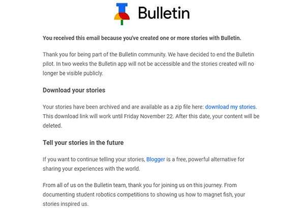 Il gruppo di Mountain View taglia un altro ramo secco: ormai prossimo alla chiusura Google Bulletin, progetto messo in campo solo all’inizio dello scorso anno che evidentemente non si è dimostrato in grado di soddisfare le aspettative. La chiusura è fissata per il 22 novembre, come comunicato da bigG agli utenti che fino ad oggi si sono affidati al servizio.
