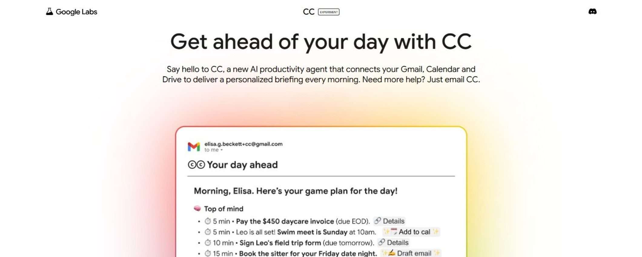 CC è un agente sperimentale costruito su Gemini di Google. Si collega a Gmail, Google Calendar e Google Drive, oltre a Internet, e impara a conoscere l’utente analizzando tutti questi dati. Ogni mattina invia un briefing personalizzato che delinea il programma per la giornata, insieme a tutte le informazioni importanti che si dovrebbero sapere.