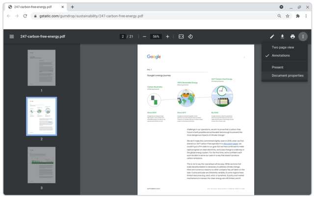 La seconda novità riguarda il lettore PDF integrato. Google ha introdotto diversi miglioramenti: nuova barra laterale con le anteprime delle pagine, modalità Presentazione che nasconde schede, barra degli indirizzi e barra degli strumenti, visualizzazione delle proprietà del documento, visualizzazione a due pagine e nuova toolbar con varie opzioni, tra cui zoom, download e stampa.
