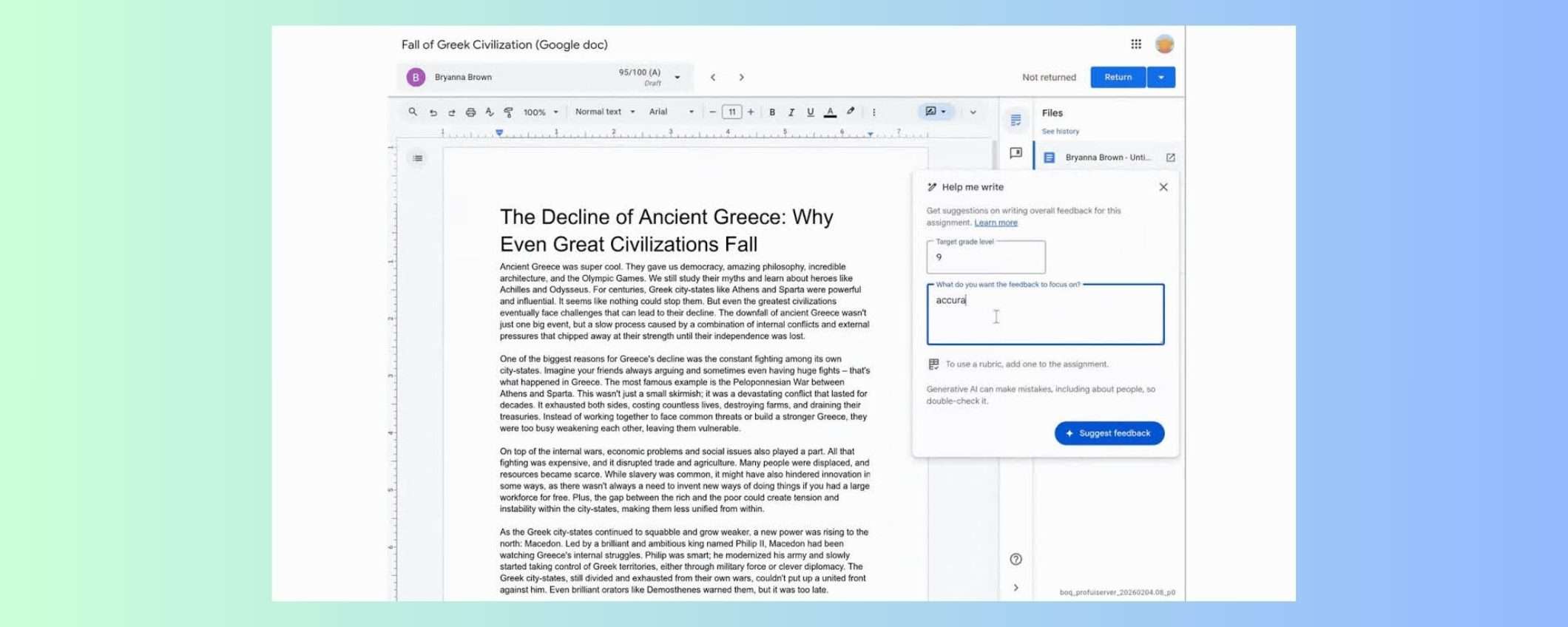 Big G ha lanciato su Google Classroom una nuova funzione basata su Gemini che permette agli insegnanti di generare feedback personalizzati sui compiti scritti degli studenti. Non è un correttore automatico, né un sistema di voti, l’insegnante resta al comando, ma è un assistente che analizza il lavoro dello studente e produce bozze di suggerimenti di miglioramento.