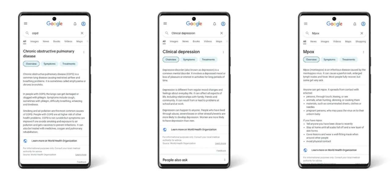 A oggi cercando malattie comuni come un semplice raffreddore si ricevono già riquadri informativi aggiuntivi nella parte superiore della pagina dei risultati. La stessa novità, però, a breve arriverà anche per depressione, diabete, Ebola, ipertensione, malaria e altre condizioni più gravi e delicate da trattare.