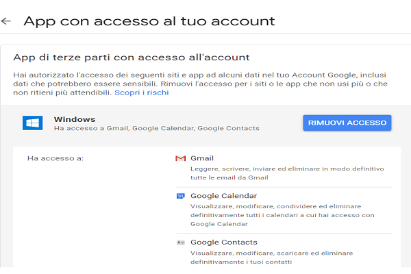 A questo punto abbiamo raggiunto un elenco completo di tutte le app che hanno accesso al proprio account Google. Per visionare l’app specifica, basterà scorrere l’elenco, anche se non si desidera eliminare nessuna app, questo passaggio permette comunque di controllare e conoscere le app di terze parti con accesso all’account. Nello specifico per revocare l’acceso, dopo aver individuato l’app in questione, selezionare la relativa voce e premere “Rimuovi accesso”, si trova nell’angolo in alto a destra. Verrà chiesto di verificare la rimozione facendo clic su “OK” nel nuovo pop up. In pochi secondi Google revocherà l’accesso all’app o al servizio. Una volta che il pop up scompare, si è rimossa con successo l’app dal proprio account. È consigliato sempre esaminare l’intero elenco, probabilmente lungo, e rimuovere tutte le app che non sono più utilizzate dall’accesso al proprio account.
