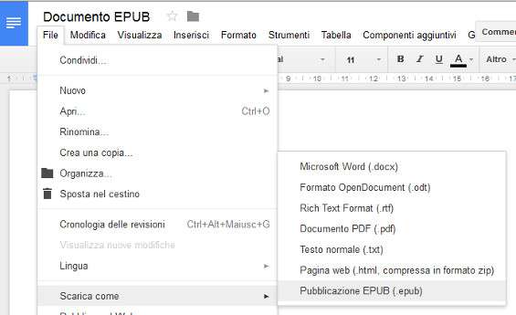 La funzione, a cui si accede semplicemente selezionando il formato.epub nel salvare il documento in locale da Google Documenti, permette di ottenere da un qualsiasi documento, anche da un documento Word importato , un file capace di adattarsi ad ogni schermo e alle esigenze dell’utente.