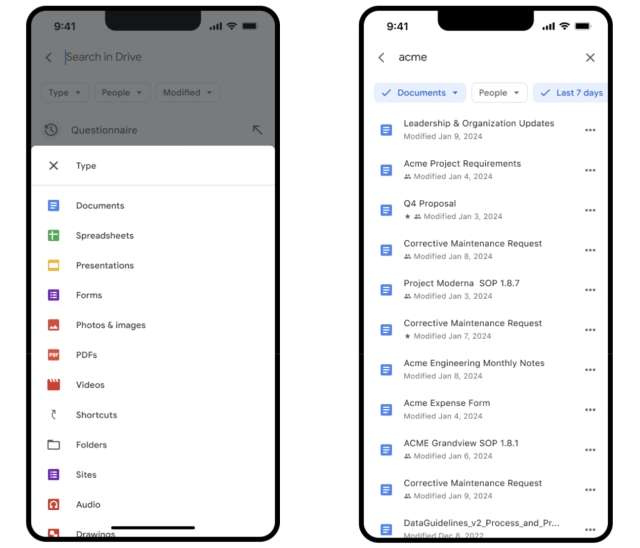 Google Drive suggerisce inoltre i filtri rilevanti durante la digitazione della query di ricerca e consente di perfezionare la ricerca dopo la visualizzazione della pagina dei risultati. È possibile anche utilizzare una combinazione di filtri. La funzionalità arriverà anche su Android nelle prossime settimane.