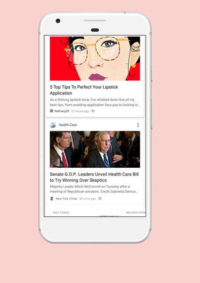 L’aggiornamento offre in aggiunta i pulsanti “follow”, da premere per essere sempre informati su vari topics : dal presidente degli Stati Uniti, Trump, ad artisti come Kendrick Lamar o su Serie TV come Game of Thrones. Nel campo dell’informazione, il feed di Google cerca di fornire differenti punti di vista, mostrando articoli da diverse fonti, come fa già Facebook. Dal momento che è parte della ricerca, il modo in cui lavora il feed di Google è però diverso da quello di Facebook, il quale mostra un mix di oggetti condivisi con gli amici e pagine per le quali si è cliccato “Mi piace”.
