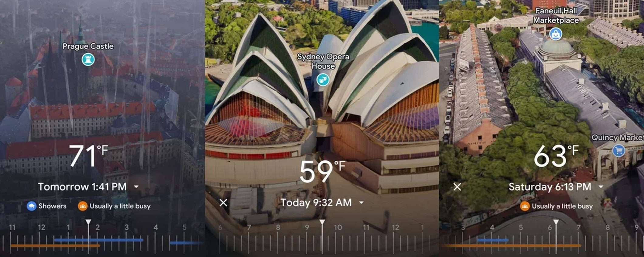 Dopo aver cercato la città in Google Maps (Android e iOS) è necessario toccare il primo video per vedere il punto di interesse dall’alto. In sovrapposizione viene mostrato un “time slider” che consente di vedere le previsioni del tempo e il livello di affollamento durante la giornata.