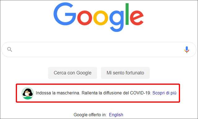 Sulla homepage di Google, oltre al campo e ai pulsanti per eseguire le ricerche, fa capolino un messaggio che consiglia di indossare la mascherina. Un dettaglio che potrebbe contribuire a fare la differenza considerando quanto la pagina sia visitata quotidianamente.