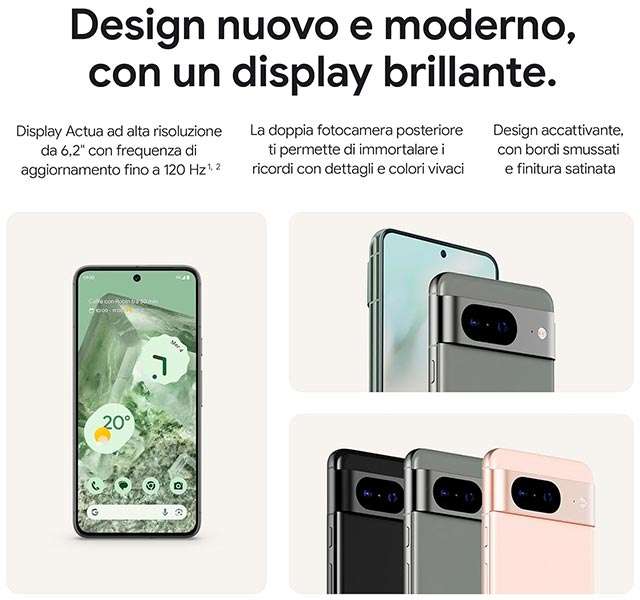 La piattaforma software è ovviamente Android con accesso a Play Store per il download delle applicazione. Tra le specifiche tecniche vale la pena citare il display Actua da 6,2 pollici con pannello OLED, risoluzione 2400×1080 pixel e refresh rate fino a 120 Hz, il processore Tensor G3 con chip di sicurezza Titan M2, 8 GB di RAM, 128 GB di memoria, la doppia fotocamera posteriore con sensore principale da 50 megapixel e IA, la selfie camera frontale da 10 megapixel, il supporto a Dual SIM, NFC, Wi-Fi 7 e Bluetooth 5.3, gli altoparlanti stereo con tre microfoni e audio spaziale, il lettore di impronte sotto lo schermo, la certificazione IP68 e la batteria da 4.575 mAh con ricarica rapida e wireless. Trovi altre informazioni nella scheda del telefono.