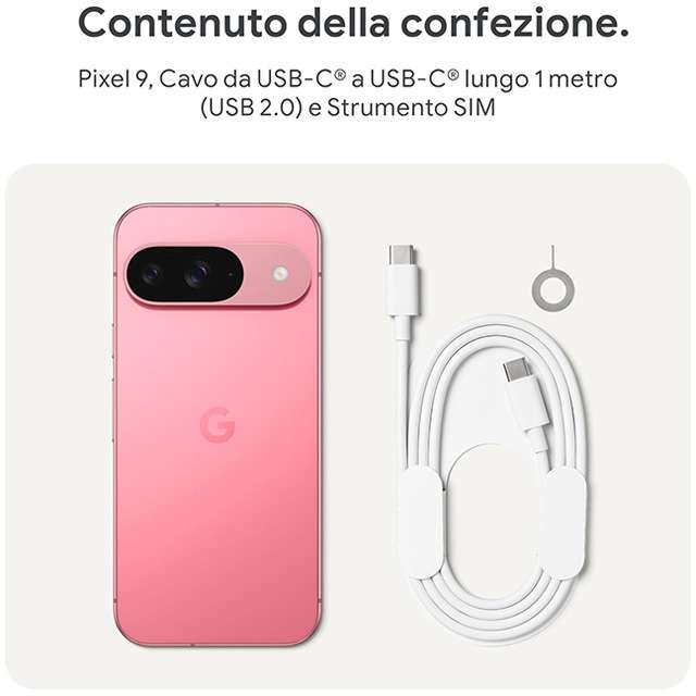 Nella confezione sono inclusi il cavo per la ricarica (da USB-C a USB-C, un metro di lunghezza) e lo strumento per la rimozione della SIM. Devi solo attivare il coupon dedicato così da sbloccare lo sconto di 90 euro e tagliare il prezzo di Google Pixel 9, per acquistarlo a 809 euro, con un notevole risparmio. Scegli la colorazione della scocca che preferisci tra Nero ossidiana, Grigio creta, Verde matcha e Rosa peonia, la spesa non cambia.