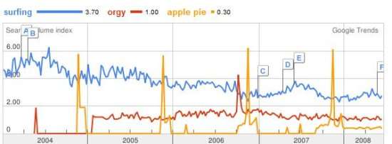 L’avvocato ha iniziato a maneggiare dei dati approssimativi: consultando Google Trends ha messo a confronto la popolarità di chiavi di ricerca quali surfare , torta di mele e orgia : se è vero che lo sport sembra ingolosire gli abitanti della Florida più del sesso di gruppo, è altresì vero che la tradizione americana rappresentata dalla torta di mele colleziona un numero ridotto di estimatori. Che i rituali orgiastici si stiano prepotentemente facendo largo nella cultura degli States?