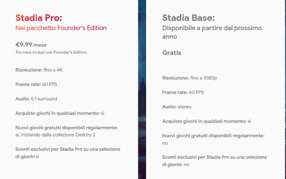 Stadia avrà da subito due forme di abbonamento disponibili: una Pro e una Base. Il costo mensile dell’abbonamento Pro sarà di 9,99€e consentirà di giocare in 4K a 60fps una serie di titoli meno recenti, mentre bisognerà acquistare a parte quelli più nuovi. Stadia Base sarà invece gratuito, ma lo streaming delle sessioni di gioco sarà limitato al Full HD (che è comunque un ottimo livello di qualità) e non ci saranno titoli inclusi nel prezzo da giocare, si potranno solo acquistare a parte. Ci teniamo a specificare che, anche qualora un utente decidesse di passare dall’abbonamento Pro a quello Base, non perderebbe comunque i diritti sui titoli acquistati, dei quali usufruirebbe però in Full HD.