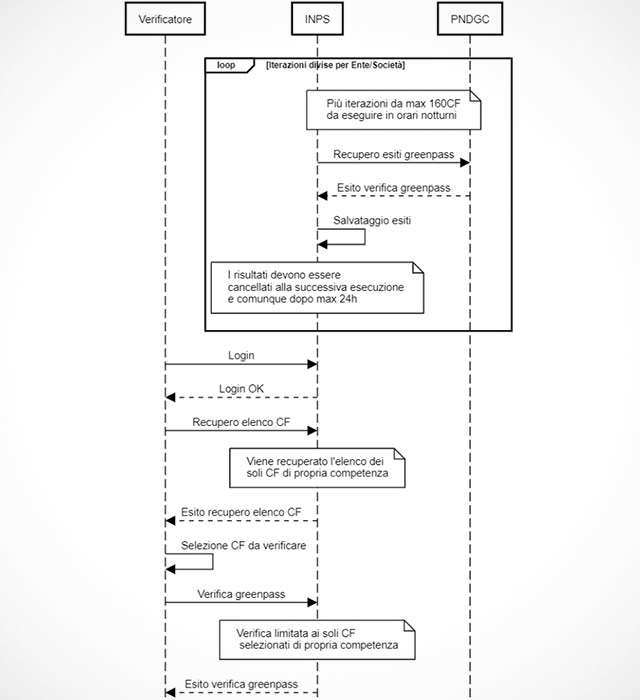 Così viene descritto lo scambio di informazioni tra INPS e la Piattaforma Nazionale, che avviene una volta al giorno. Il verificatore non può sapere se il Green Pass esaminato è stato rilasciato in seguito a vaccino, guarigione da COVID-19 o tampone: tutto ciò che visualizza è il risultato del controllo, positivo o negativo.