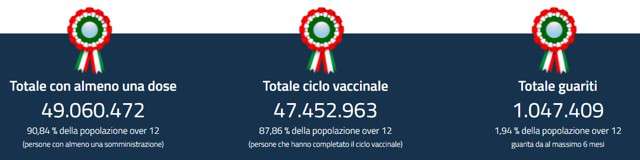 - italiani con 1 dose: 49,06 milioni (90,84% della popolazione over 12)