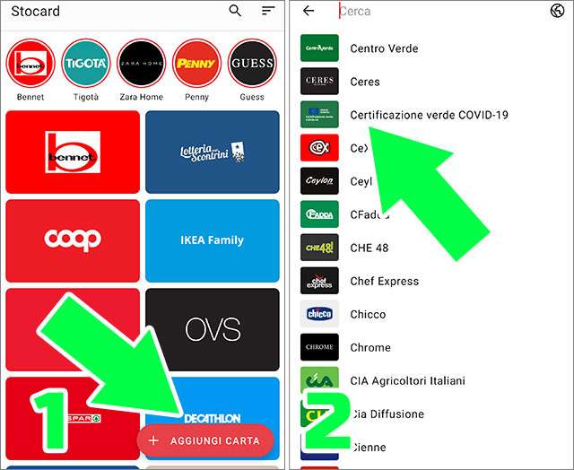 È disponibile per il download gratuito nelle versioni Android (da Play Store) e iOS (da App Store). Il processo è piuttosto semplice. Una volta installata, non bisogna fa altro che avviarla, premere il pulsante “+ Aggiungi carta” (1) posizionato nell’angolo inferiore destro dell’interfaccia e cercare “Certificazione Verde COVID-19” (2) dal lungo elenco che compare.
