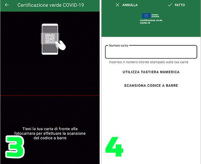 È poi necessario effettuare la scansione del codice QR (3) tramite la fotocamera oppure inserire manualmente l’Identificativo Univoco del Certificato (4) o Unique Certificate Identifier.