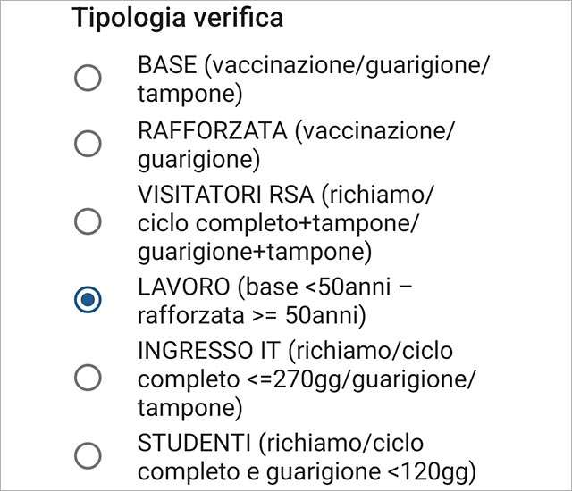 - Rafforzata (Vaccinazione / Guarigione): VerificaC19 considera valido solo il certificato verde da vaccinazione o da guarigione e le certificazioni di esenzione dalla vaccinazione.