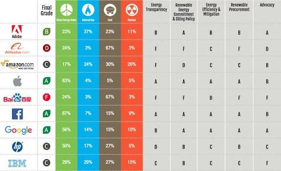 Discorso analogo fatto per le grandi aziende asiatiche che si occupano di cloud e servizi IT: anche lì Greenpeace caldeggia un cambio di passo per abbracciare un mix di energie capace di produrre meno CO2 emessa in atmosfera e che punti decisamente alle fonti alternative ritenute pulite. Alibaba e Baidu, due dei colossi di Cina, racimolano appena una D e una F rispettivamente: loro, come molte altre imprese d’Oriente, soffrono soprattutto della mancanza di energie rinnovabili nella regione , “vittime” per così dire di una situazione generale che privilegia le energie fossili e stenta ancora ad avviare un ciclo basato su fotovoltaico ed eolico .