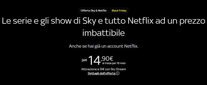 In questi giorni di Black Friday segnaliamo l’offerta per il pacchetto Sky TV e Netflix, al prezzo scontato di 14,90 euro al mese per 18 mesi invece di 30 euro. Si tratta del prezzo più basso dell’anno, che consente di risparmiare oltre 270 euro.