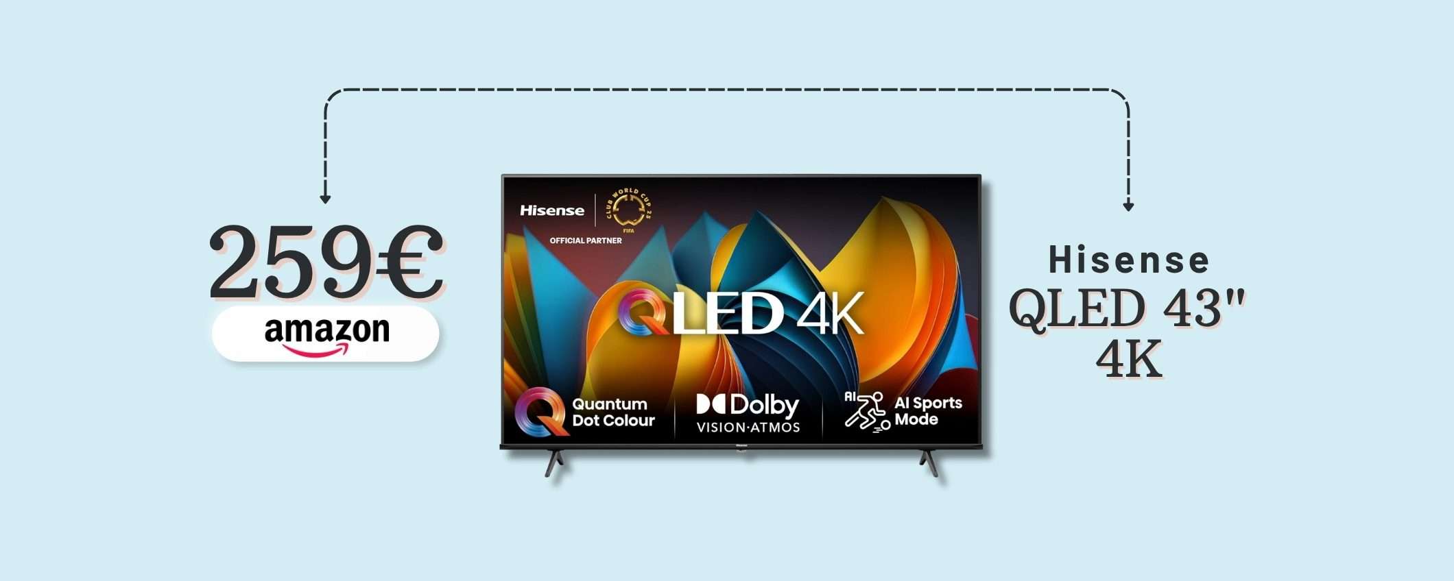 Metti la tua Hisense QLED 43″a soli 258,99 euro nel carrello. Tutto merito dello sconto del 35% su Amazon che ti fa risparmiare e non poco.