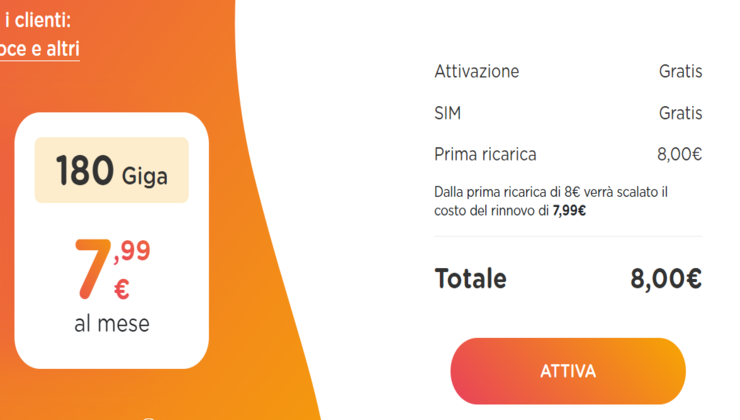 Con un generoso 180 GB di Internet, questo piano è disponibile a un prezzo incredibilmente interessante di soli 7,99 euro al mese.