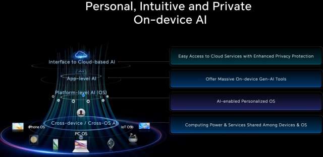 Al livello più basso, l’IA cross-device e cross-OS costituisce la base di un ecosistema aperto che consente la condivisione di potenza di calcolo e servizi tra dispositivi e sistemi operativi. Il secondo livello (IA a livello di piattaforma) consente di avere un sistema operativo personalizzato che abilita l’interazione uomo-macchina e l’allocazione personalizzata delle risorse.