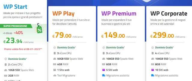 Pagando soltanto 23.94 euro + IVA all’anno, invece di 39,90 euro, puoi acquistare subito il pacchetto WP Start che include: