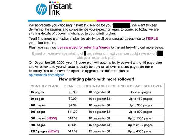 Come si può vedere l’email si rivolge anche a coloro che stampano fino a 15 pagine al mese ovvero gli utenti che hanno scelto la formula Free Ink for Life del tutto gratuita, un’iniziativa messa in campo da HP per attirare nuovi utenti contando poi sul fatto che una parte di questi finisca per stampare un volume maggiore di copie affrontando un esborso e generando così un guadagno. A loro viene ora chiesto di mettere mano al portafogli e pagare 0,99 dollari mensili. Insomma, la variante gratis sembra destinata a sparire.