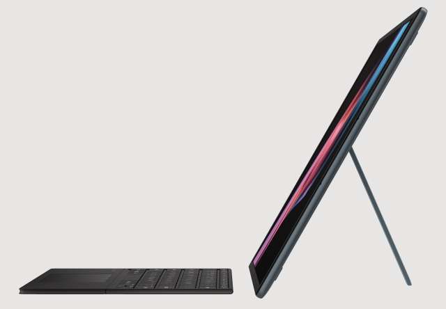 In modalità laptop, la tastiera deve essere posizionata su una parte dello schermo. Quindi la diagonale si riduce a 12,3 pollici. La porzione di display tra la tastiera e la cerniera può essere utilizzata come estensione dello schermo o come secondo schermo (ad esempio per gli strumenti di Photoshop).