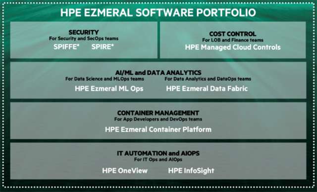 Tra questi HPE Ezmeral Container Platform (anche come parte integrante di HPE GreenLake) per la distribuzione e gestione delle applicazioni containerizzate su vasta scala in qualsiasi infrastruttura, HPE Ezmeral Data Fabric e il progetto open source KubeDirector.