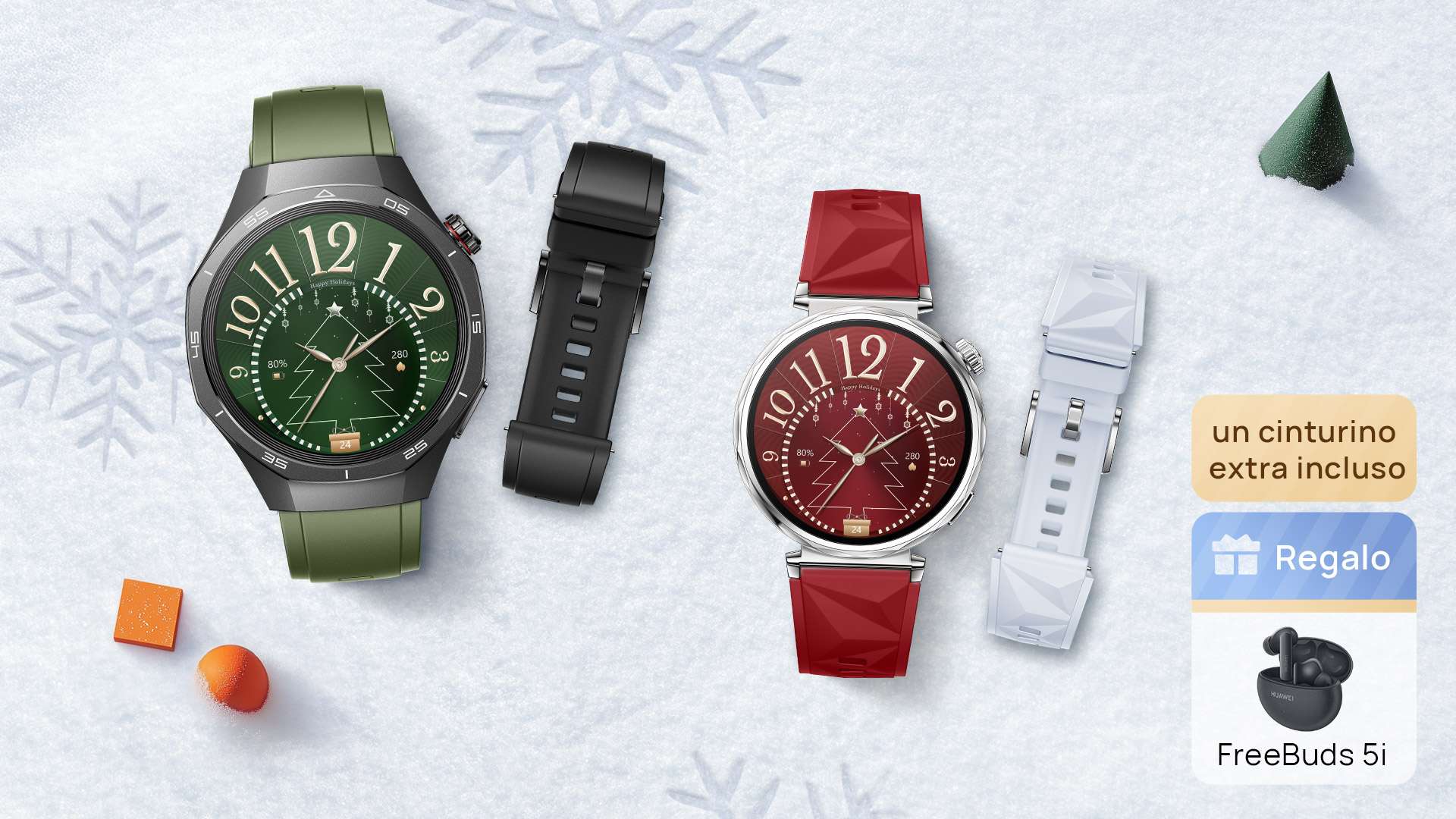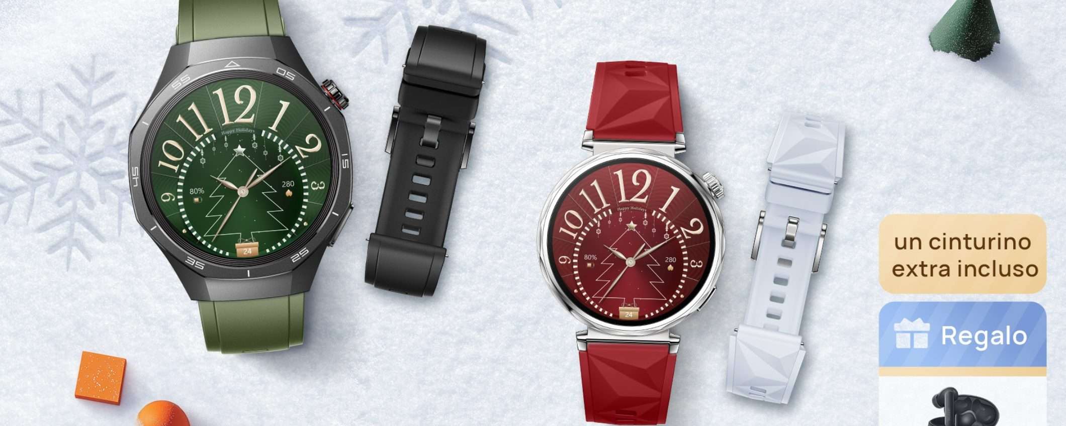 - HUAWEI Watch GT5 Christmas Edition 41mm: include un cinturino extra rosso, perfetto per l’atmosfera delle feste.
